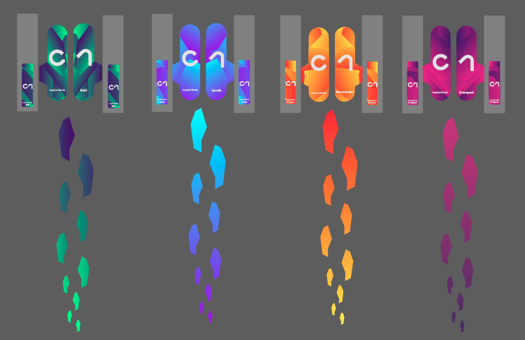 From these variants, 4 colours were picked to represent each of the cities as part of their culture or tradition, such as green for the ocean marina for Hull and blue for Leeds for the economy. We liked to be able to show that each city had something different to offer.